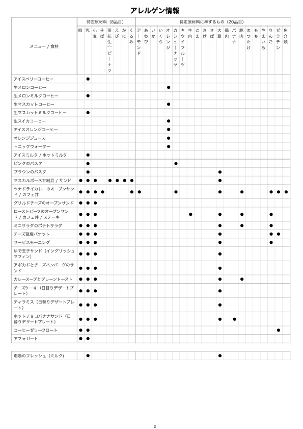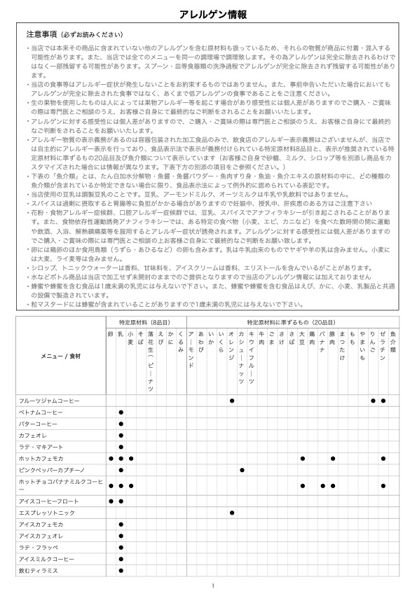 ※厚生労働省のいう特定原材料8品目と特定原材料に準ずるもの20品目及び魚介類について該当するメニューのアレルゲン情報を表示しています(該当しないメニューは表示していません)
