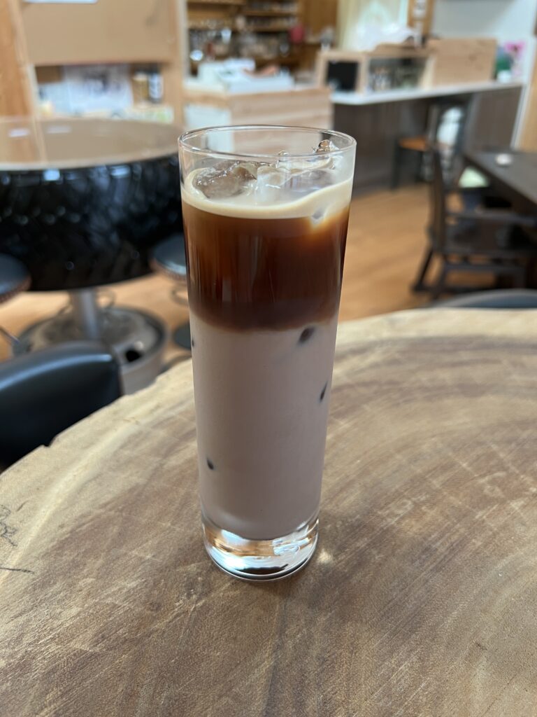 クリーム系を盛らないシンプルなおいしさが魅力のチョコミルクコーヒー。甘すぎないチョコレート味の牛乳にコーヒーを重ねて大人な見た目のアイスコーヒードリンク