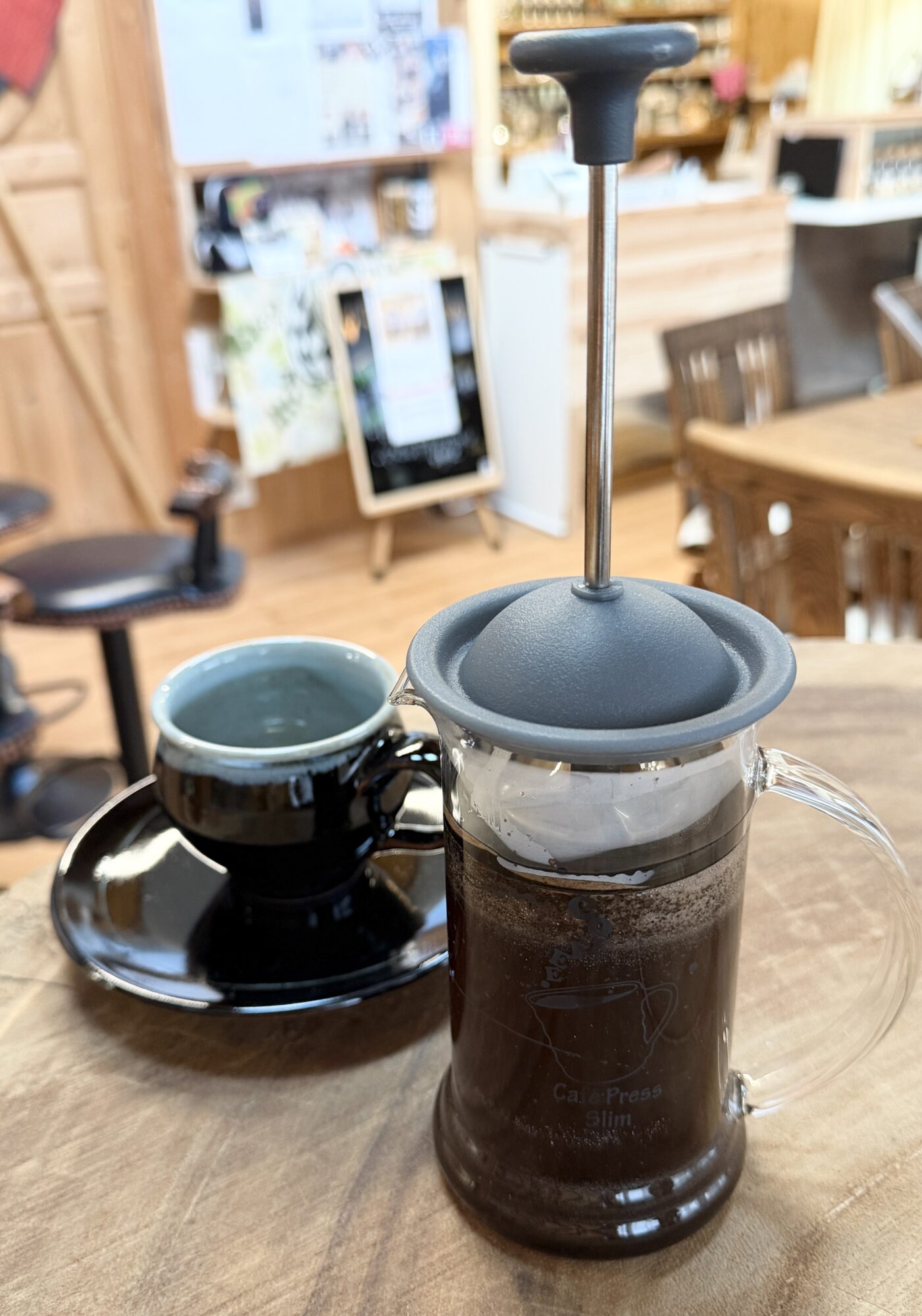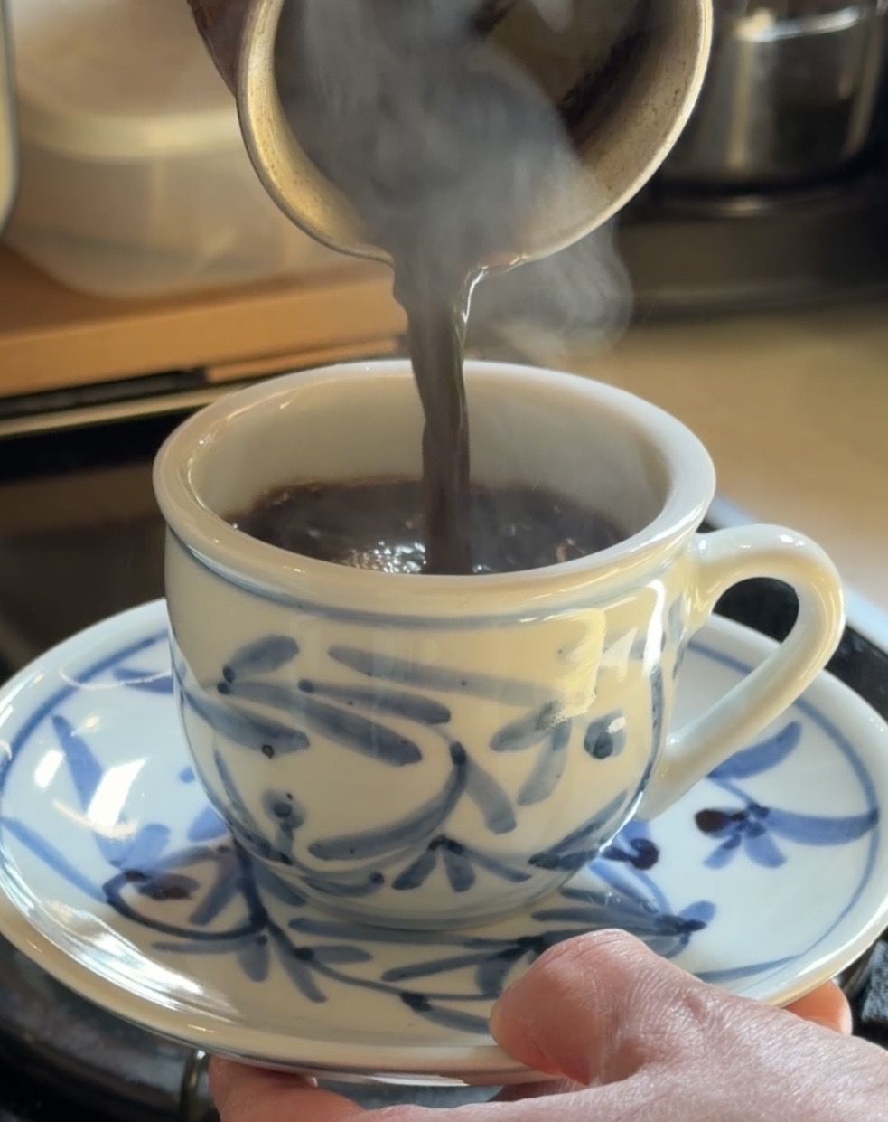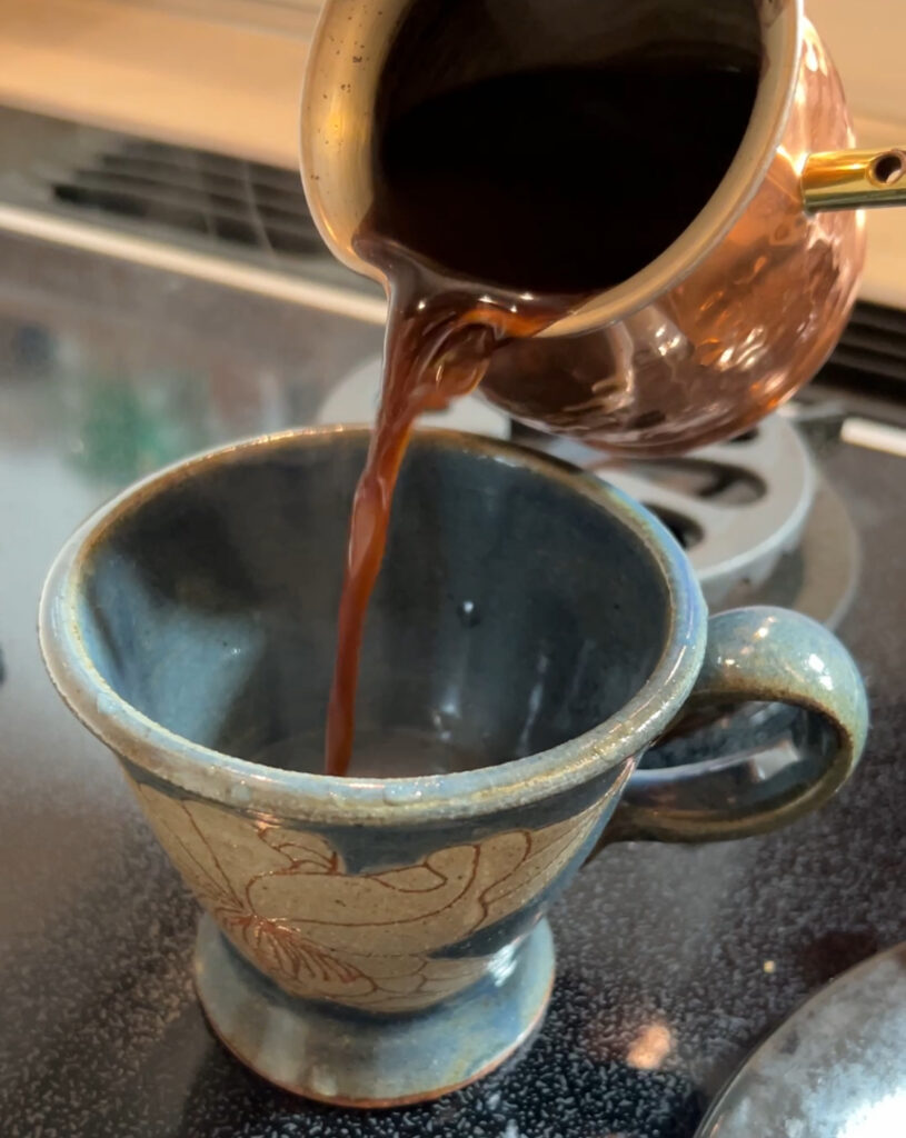 深煎り豆のコーヒー粉をたっぷり使ってイブリックで煮出して抽し粉ごとカップへ注いでご提供します。コーヒー粉がカップの底へ沈んだ頃に上澄みだけをお飲みください