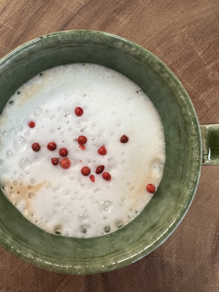 エスプレッソに甘くないミルクを加えたカプチーノにマダガスカル産のピンクペッパーをトッピング!