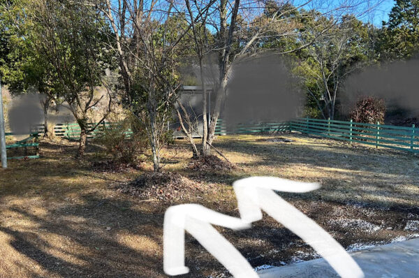 作業は、画像の白い矢印の2本の木の除去になります。既に夫がこの2本の木を切り倒して(薪にして)いますので、土曜日は、この根(切り株)を職人さんに取り除いていただく作業になります。土の下には配線等が通っており慎重を期す作業となりますし寒い中で職人さんたちにはご負担をおかけすることとなりますがよろしくお願いいたします